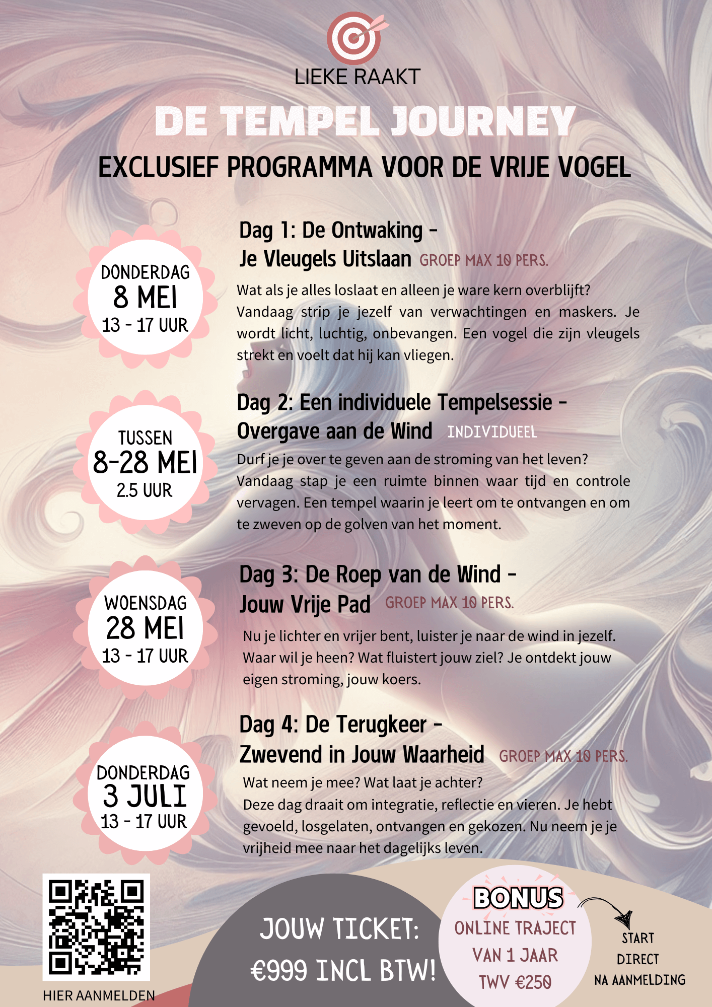 Naast een tempelsessie is het ook mogelijk om een diepgaandere TempelJourney te doen. Tijdens deze reis ervaar je niet alleen de energie van de tempel, maar leer je deze ook begrijpen. Ik neem je mee op een innerlijke ontdekkingstocht, waarbij de betekenis en werking van de tempelenergie op een dieper niveau voelbaar en inzichtelijk wordt.
